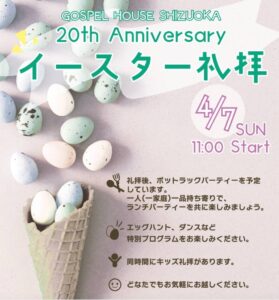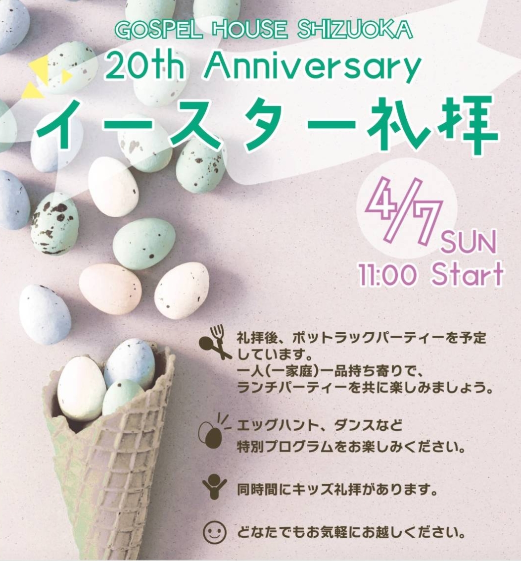 HAPPY EATER ❣もうすぐイースターですね!今年もイエス様の復活をお祝いしましょう!そして、ゴスペルハウス静岡は今年で20周年を迎えます。これまでの歩みとこれからの歩みに感謝と期待を込めて 皆さんで楽しいひと時としたいと思います。午後はランチしながらワイワイとお楽しみに…♡