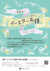みなさん、こんにちは!今年はもくせい会館でイエス・キリストの復活をお祝いしましょう!ゴスペルメッセージ、ダンス、スペシャル賛美、エッグハントなど、楽しい礼拝です!どなたでも歓迎します♡(自由献金あります、駐車場はもくせい会館か近隣のコインパーキングを使用してください。ランチは各自必要な方はご持参下さい。)
